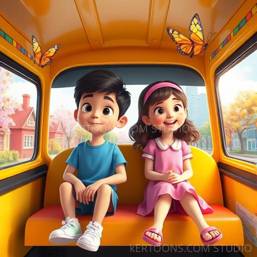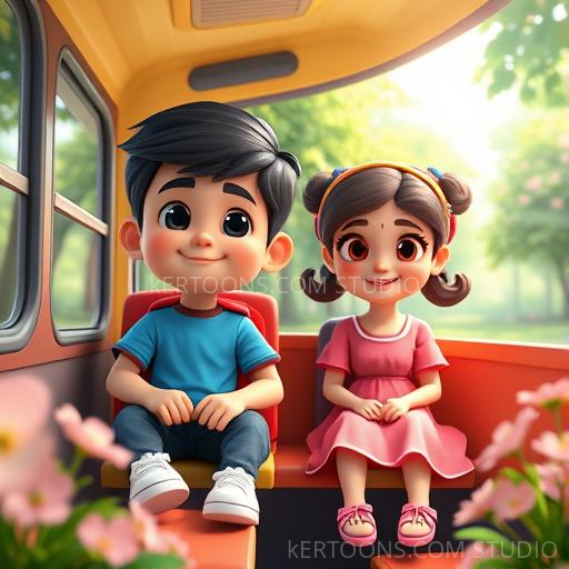 On a bright spring morning, Ramu and Site eagerly boarded the colorful school bus, their eyes sparkling with excitement. The lush green forest stretched endlessly, filled with the sweet scent of blooming jasmine and the cheerful chirping of birds. As the bus rolled along, children giggled and pointed at butterflies fluttering by, dreaming of the adventures awaiting them amidst the trees and the mysterious cave hidden nearby. Ramu held Site’s hand, both feeling the thrill of discovery and friendship in the warm sunlight.