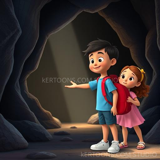 While exploring the edge of the forest, Site’s curiosity led her closer to the dark entrance of the restricted cave. Suddenly, she slipped inside, and the heavy mouth of the cave swallowed her up. Ramu’s eyes widened in shock as he saw her vanish into the shadows. The cave was cold and silent, with flickering shadows dancing on the damp walls. Ramu’s heart pounded with worry, knowing time was slipping away as the school tour was about to end. He felt a mix of fear and determination to help his friend.