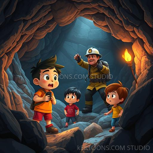 Ramu quickly told his teacher, who called the brave firefighter with special equipment. The firefighter arrived, shining a bright torch and carrying a sturdy ladder. Ramu stayed calm, talking softly into his walkie-talkie, encouraging Site to stay brave. The firefighter carefully navigated the tricky, winding passages of the cave, his face determined and gentle. Ramu watched anxiously, feeling a surge of hope as the rescue team worked together, their teamwork shining like a beacon of courage in the dark.
