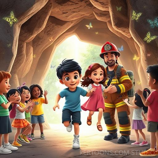 Deep inside the cave, the firefighter gently freed Site from a fallen rock. Ramu’s heart leaped with joy as he saw her safe and smiling. The firefighter carefully carried Site out, her eyes shining with relief. The children cheered as she emerged into the sunlight, wrapped in a warm hug from Ramu. The cave, once mysterious and frightening, now felt like a place of bravery and hope. Everyone clapped, and Ramu felt proud, knowing that his courage had helped save his best friend.