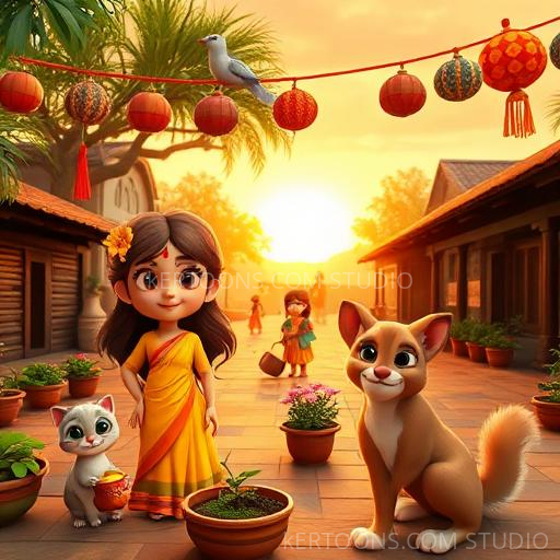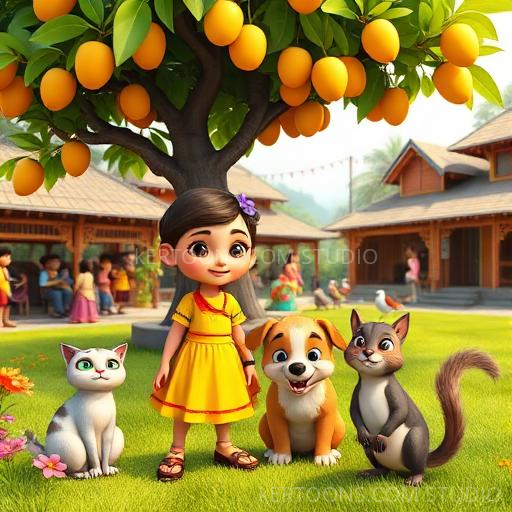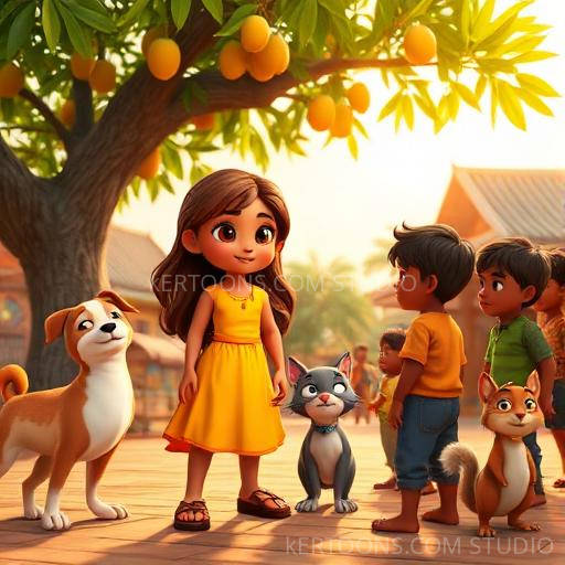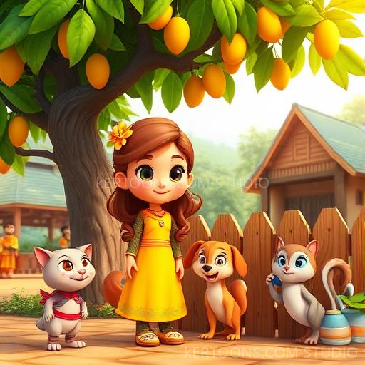 Mira, a kind-hearted girl with sparkling eyes, stepped forward with a gentle smile. She explained to the villagers how the mango tree was feeling tired and hurt because some people had been too rough—breaking branches and taking mangoes before they were ripe. The villagers listened carefully, their faces softening with understanding. Together, they decided to build a small wooden fence around the tree, a symbol of their promise to be gentle. Mira and the children vowed to water the tree every morning, while the animals, Raju, Pari, and Chiku, promised to help protect it from harm. A new hope blossomed in everyone's hearts.