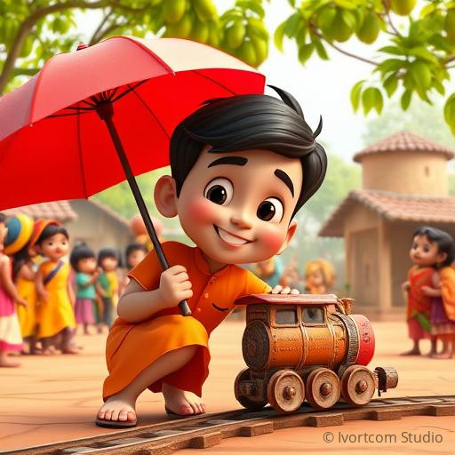 In a tiny village nestled amidst lush green fields and colorful mango trees, there was a magical toy train town called Chhoti Rail Gali. Every evening, children would gather around the tiny tracks, eagerly waiting for the miniature train to chug along. One sunny day, the train suddenly stopped in the middle of the track, and the children wondered what had gone wrong. Little Raju, with his bright kurta and mischievous smile, decided to find out the mystery. As he looked closer, he saw a tiny pebble blocking the wheels, and with a gentle push, he set the train rolling again, filling everyone with joy and wonder. The village learned that even small acts of kindness can keep the magic alive.