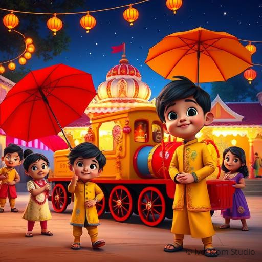As the days went by, the children of Chhoti Rail Gali decided to decorate their toy train for the upcoming festival of Diwali. They painted bright colors—reds, yellows, and blues—and hung tiny lanterns and marigold garlands along the sides. The train looked like a moving rainbow, ready to bring happiness to everyone. On the night of Diwali, the entire village gathered to watch the decorated train light up the dark sky, just like the stars above. The children felt proud and happy, knowing that their teamwork and creativity had made the festival more special. It was a reminder that sharing joy brings everyone closer.