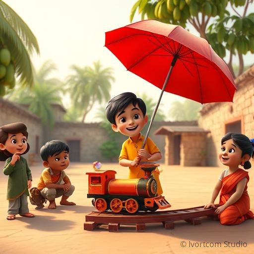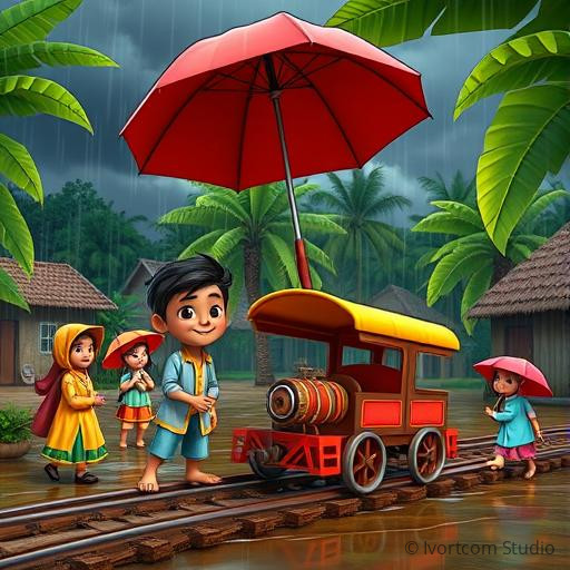 One monsoon evening, a sudden rainstorm threatened to wash away the tiny tracks and the joyful memories of the village. The children hurried to cover the train and the tracks with large banana leaves and colorful umbrellas. Raju, holding a big red umbrella, encouraged everyone to work together. Despite the pouring rain, their teamwork kept the train safe and dry. As the storm passed, the sun peeked out, casting a golden glow over the village. The children learned that even in difficult times, unity and caring hearts can turn challenges into moments of hope and happiness.