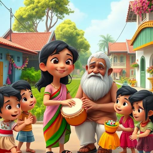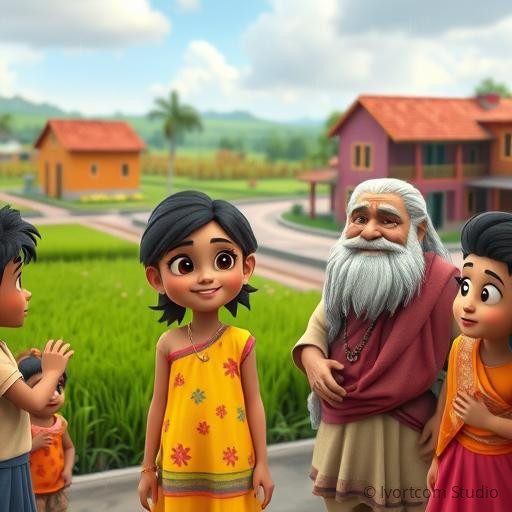 As the children performed their silly dances, a wise old man from the village, Baba Ram, watched with a gentle smile. He told them stories of ancient India where laughter was believed to be a divine gift that could heal hearts and bring people together. Inspired, the children decided to create a big laughter circle, where everyone would share their funniest memories. When they did, even the shyest child burst into giggles, and the village echoed with joyful sounds. Baba Ram nodded happily, knowing that the true magic was in their shared happiness and kindness.