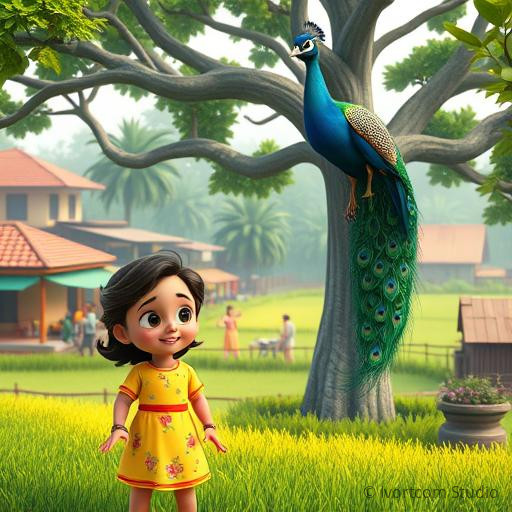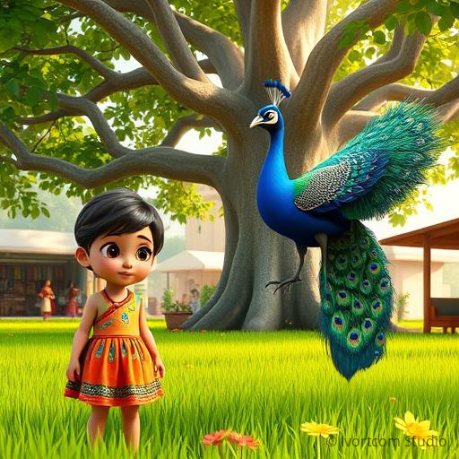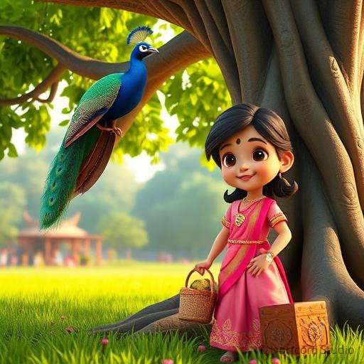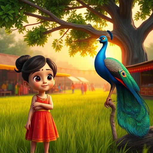 In a vibrant Indian village nestled between lush green fields and colorful markets, there lived a curious little girl named Anika. One sunny morning, she heard a strange whisper coming from the tall banyan tree in her backyard. To her amazement, she discovered a magnificent peacock with shimmering blue and green feathers, who suddenly spoke! 'Hello, Anika! I am the talking peacock. I can share stories from the royal palaces and enchanted forests.' Anika's eyes sparkled with wonder as she wondered how a peacock could talk. Excited, she decided to listen to the peacock’s stories and learn about the magic of nature and kindness.