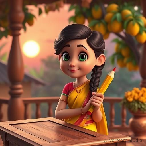 That evening, as the sun dipped behind the mango trees, the pencil whispered tales of ancient India—of brave warriors, wise sages, and colorful festivals like Diwali. Anjali listened with wide eyes, feeling as if she had traveled back in time. The pencil’s stories made her dream of adventures, of helping her village and sharing happiness. She realized her simple pencil was a treasure chest of stories waiting to be told.