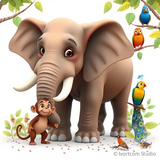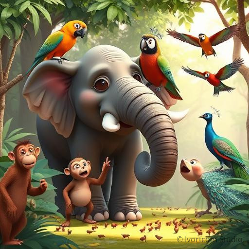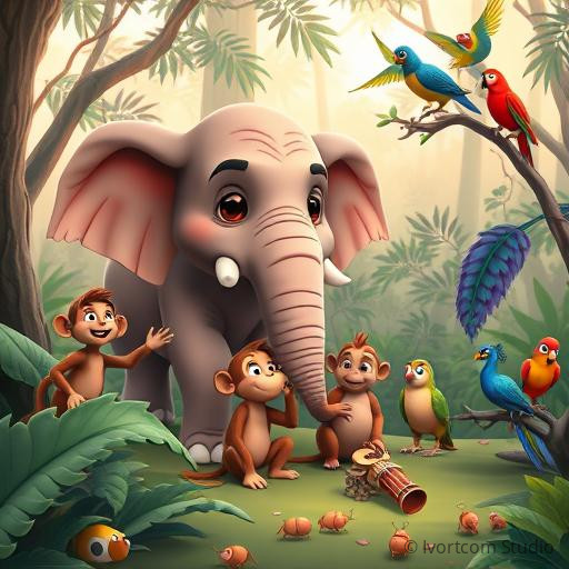 In the heart of a lush Indian jungle, where vibrant peacocks dance and colorful parrots sing, the animals discovered a strange silence. The usual symphony of chirping crickets, chattering monkeys, and singing birds had suddenly stopped. Curious and a little worried, the wise old elephant, Gaja, called all the animals together. 'Something is missing,' he rumbled softly. The jungle needed its music again! The animals decided to form their own orchestra, each bringing their unique sounds to create a magical melody that would fill the jungle with joy once more.