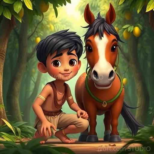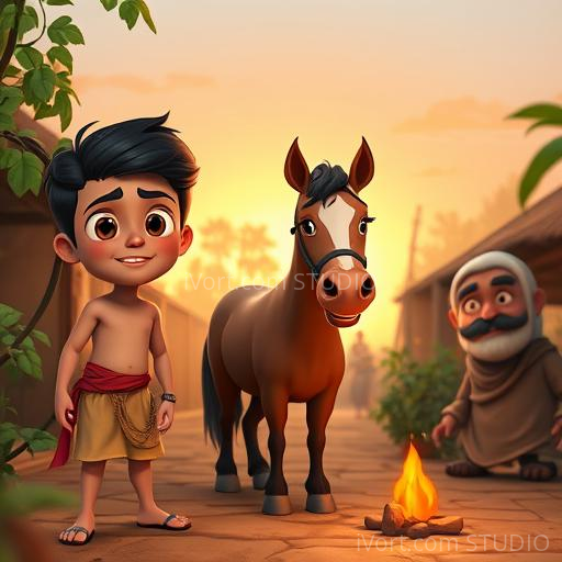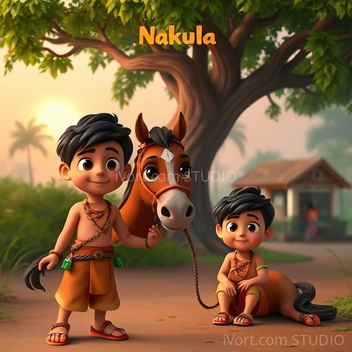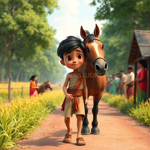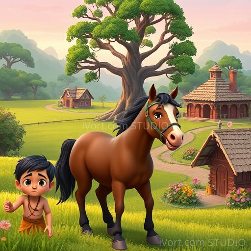 In a peaceful Indian village nestled between lush green fields and colorful flower gardens, Nakula, a gentle and curious boy with bright eyes, wakes up to find his beloved horse, Chandrapal, missing. The morning sun casts a golden glow over the village, and Nakula feels a mix of worry and determination. He remembers how Chandrapal loved to graze near the banyan tree and decides to search for his friend, hoping to find him soon.