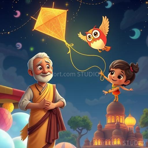 As Anya held her dream bubble close, it gently floated upwards, transforming into a sparkling kite that soared into the sky. She watched in awe as it danced past the mango trees and over the temple spires, carrying her hopes high above the village. Suddenly, the kite twirled and dipped into a cloud, revealing a world of shimmering stars, glowing lotus ponds, and friendly celestial creatures. Anya felt a mix of wonder and a tiny flutter of nervousness—her dream was taking her somewhere magical!