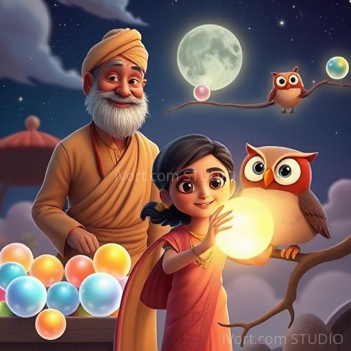 In a bustling Indian village nestled between lush green fields and colorful markets, there lived a peculiar merchant named Ramu. Unlike other traders, Ramu sold dreams—tiny shimmering bubbles filled with hopes, adventures, and magic. One evening, a curious little girl named Anya approached him, asking, 'Can I buy a dream that takes me to the stars?' Ramu smiled warmly and handed her a glowing bubble, whispering, 'Choose wisely, for dreams are the keys to your heart.' Anya's eyes sparkled with excitement, eager to see what her dream would bring.
