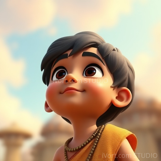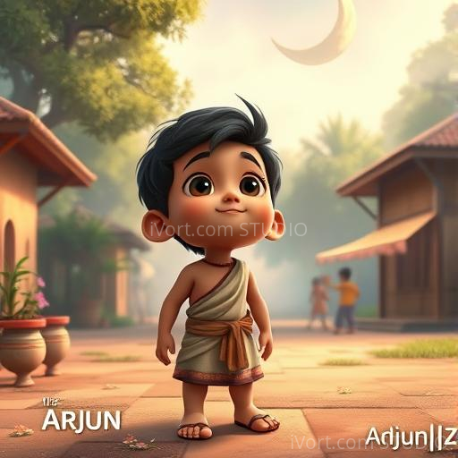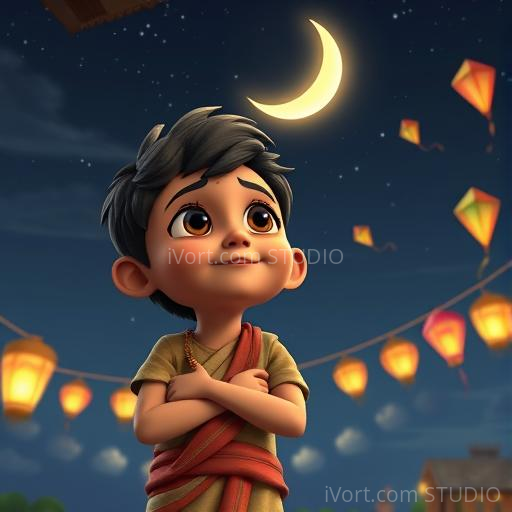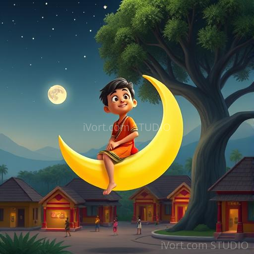 In a small, vibrant Indian village nestled between lush green fields and colorful markets, there lived a curious boy named Arjun. One clear night, as he gazed at the sky, he noticed the crescent moon shining brighter than ever. Suddenly, he felt a gentle tug and found himself floating upward, riding the shimmering crescent moon like a magical chariot. His eyes sparkled with wonder as he wondered what adventures awaited him beyond the stars.