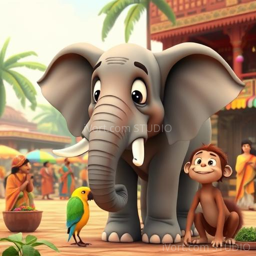 In a vibrant Indian village nestled between lush green fields and colorful markets, there lived a gentle elephant named Gaja. Gaja was curious about everything, especially the bright colors of the flowers and the shimmering sari fabrics worn by women in the village. One sunny morning, Gaja wondered, 'What if I could create something as beautiful as a rainbow?' His big ears twitched with excitement as he decided to find a way to paint his own rainbow, but he didn't know how. The villagers watched with smiles, encouraging Gaja's creative spirit.