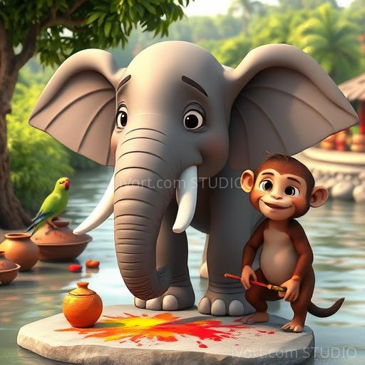 Gaja wandered to a nearby riverbank where the water sparkled under the sun. He saw children playing with colorful powders and women painting intricate designs on pots. Inspired, Gaja dipped his trunk into a pot of bright red ochre and then into yellow turmeric. With gentle strokes, he tried to paint on a large flat stone. To his surprise, the colors blended beautifully, creating a vibrant mosaic. Gaja’s eyes sparkled with joy—he had discovered his own way to make art!