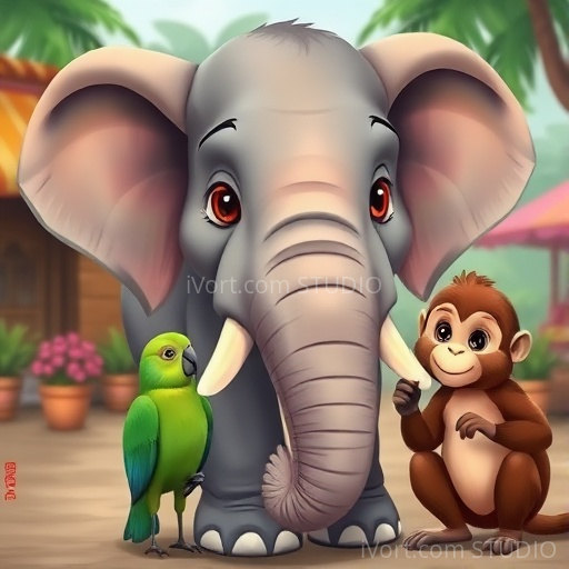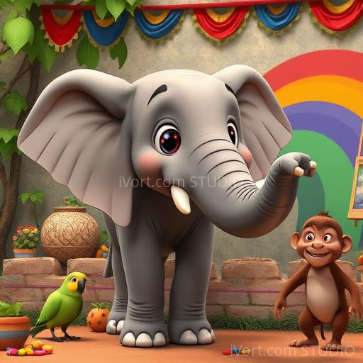 One day, the village festival was approaching, and everyone wanted to decorate with bright colors. Gaja wanted to contribute, but he worried, 'Will my painting be good enough?' With encouragement from his friends—a wise parrot and a playful monkey—Gaja decided to try painting a giant rainbow across the village wall. As he painted, his trunk moved with care and joy. The villagers gathered, clapping and cheering as Gaja’s rainbow grew brighter and more beautiful than anyone had imagined.