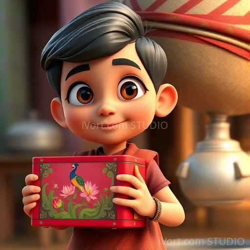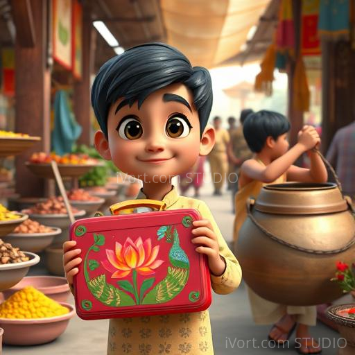 In a lively Indian village, young Tariq loved his colorful tiffin box decorated with peacocks and lotus flowers. One sunny morning, as he opened his tiffin, he noticed a shimmering glow and suddenly, the box started to vibrate! Curious and a little nervous, Tariq held it tight. To his amazement, a swirl of bright lights surrounded him, and he found himself in a bustling ancient marketplace, filled with vibrant stalls, fragrant spices, and cheerful villagers dressed in traditional dhotis and sarees. Tariq realized his tiffin box was a magic portal! He wondered what adventures awaited him in this new time.