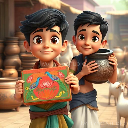 Tariq wandered through the marketplace, marveling at the sights and sounds. Suddenly, he saw a young boy struggling to carry a heavy pot of water. Tariq remembered his own grandmother’s stories about brave children in history. He decided to help! As he lifted the pot, he noticed a strange symbol on its side that matched the one on his tiffin. With a gentle glow, the symbol shimmered, and Tariq felt a gentle tug. He realized that his tiffin was not just a box but a key to learning about India’s rich history and helping those in need.