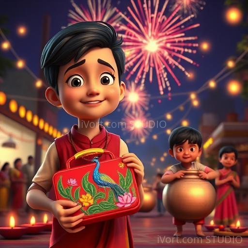 Suddenly, the glow grew brighter, and Tariq found himself in a shimmering festival of lights—Diwali! The sky was filled with fireworks, and everywhere, children played with sparklers and decorated diyas. Tariq’s heart filled with joy as he joined in the celebrations, sharing sweets like ladoos and jalebis. He realized that festivals bring people together, sharing happiness and light in dark times. With a smile, he understood that the true magic was in kindness, community, and celebrating together.
