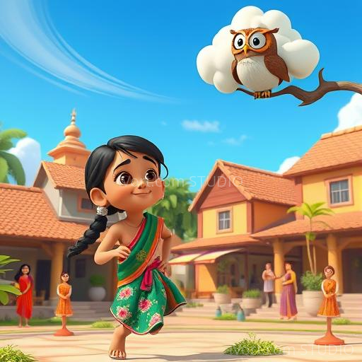 One bright morning in a lively Indian village, Mina looked up at the sky and saw a strange, fluffy cloud shaped like the letter 'A'. Curious and excited, she wondered if the clouds could be more than just water vapor—they might be magical letters! Mina decided to follow the cloud to discover its secret, feeling a flutter of adventure in her heart.