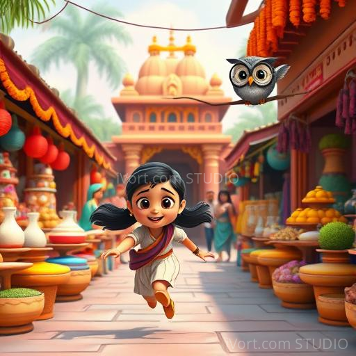 Mina ran through the bustling village streets, her eyes fixed on the floating alphabet cloud. Along the way, she passed a colorful marketplace filled with fragrant spices, bright fabrics, and cheerful shopkeepers. The cloud drifted higher and higher, guiding her past a temple decorated with marigold garlands, filling her with wonder and excitement.