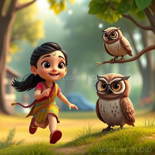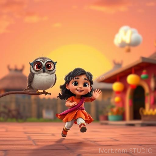 In the heart of the forest, Mina met a wise old owl wearing tiny spectacles. The owl explained that each letter is special and can create wonderful words—like 'Bharat' for India, 'Bindi' for tradition, and 'Basmati' for fragrant rice. Mina realized that the alphabet was a treasure chest of stories, culture, and magic, just waiting to be explored.