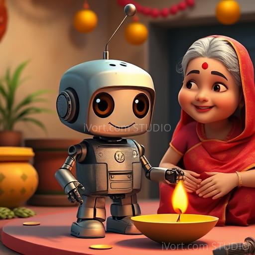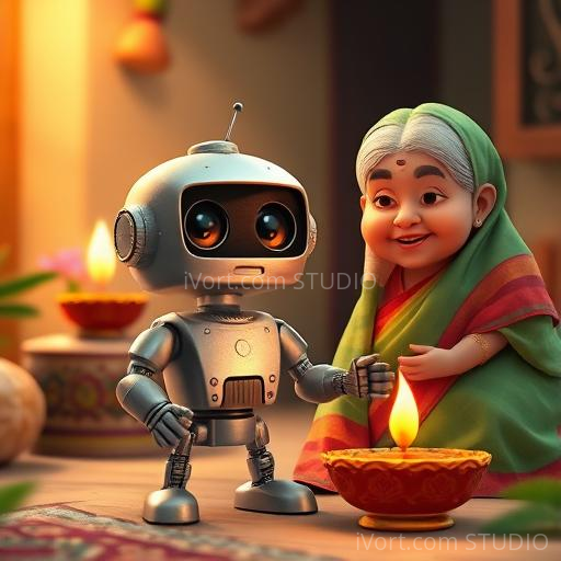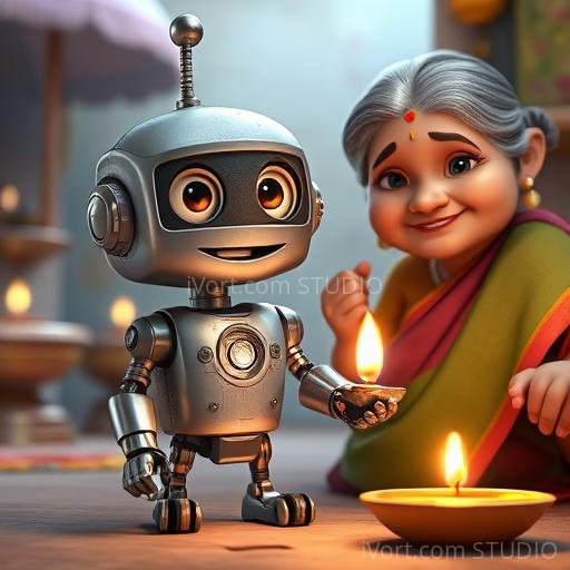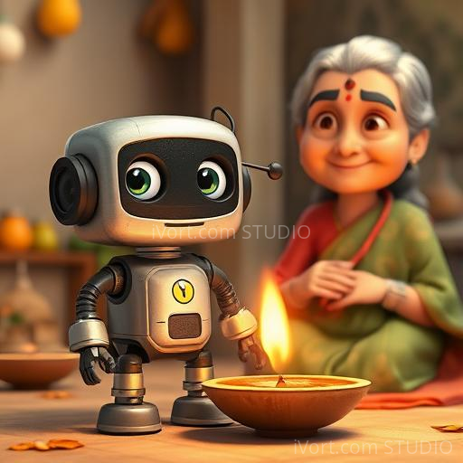 In a colorful Indian village nestled between lush green fields and vibrant markets, a tiny robot named Raju was built by a kind-hearted inventor. Raju was curious about everything, especially about making friends. But there was one thing he didn’t understand—how to give a hug! One sunny morning, Raju watched children playing and hugging their elders, feeling a strange longing inside his metal heart. He wondered, 'How can I show I care if I don’t know how to hug?'