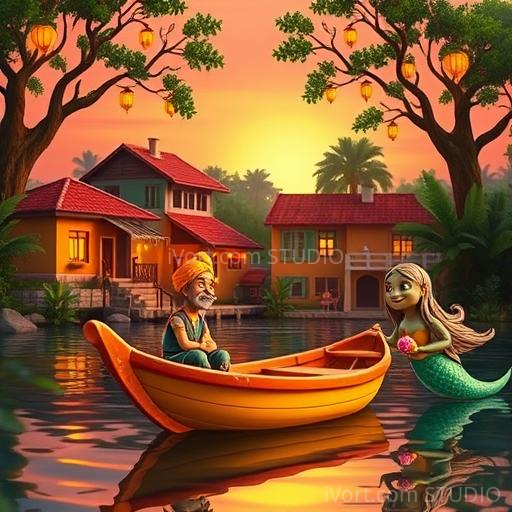 In a vibrant Indian village nestled between lush green fields and colorful houses, a tiny wooden boat named Chotu dreamt of adventures beyond the river. Chotu was no ordinary boat; painted in bright marigold yellow with delicate patterns of peacocks, he shimmered under the warm sun. One evening, as the villagers celebrated Diwali with twinkling lamps and joyful dances, Chotu gazed at the starry sky and wondered, 'Can I reach those shining lights?' A gentle breeze whispered promises of a grand journey, filling Chotu with hope and curiosity.