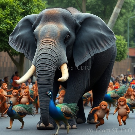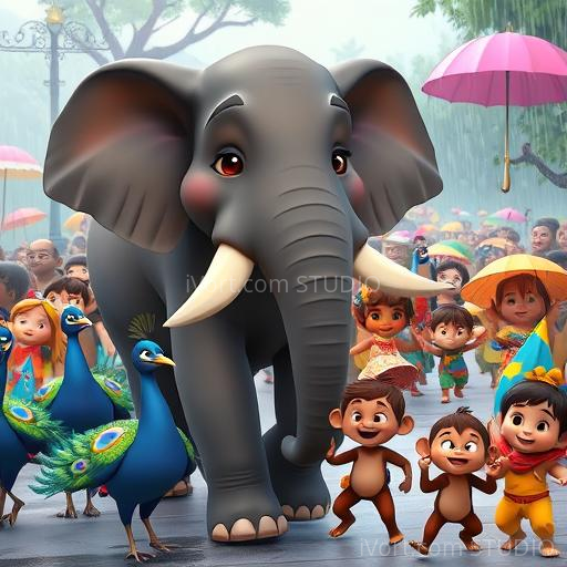 With his big, gentle steps, Appu takes the lead, trumpeting loudly to rally everyone. His friends, the peacocks, monkeys, and children, follow happily, waving colorful flags and singing traditional folk songs. The rain makes the parade even more lively, with everyone dancing under the big banyan tree decorated with marigold garlands. Appu feels proud and joyful, knowing he is making everyone smile despite the weather.