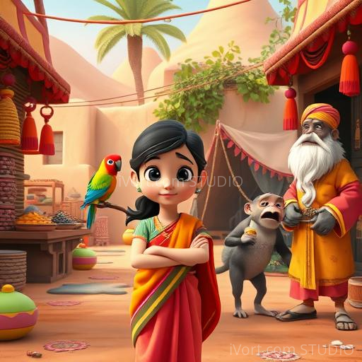 In the heart of a vibrant Indian desert village, the sun shone brightly over the shimmering Golden Oasis, a place believed to hold magical waters. One morning, the villagers woke up to find the sparkling water mysteriously vanished! Little Rani, a curious girl with bright eyes and a colorful sari, decided to solve the mystery. She felt a flutter of excitement and a little worry, knowing that the oasis was vital for everyone’s happiness. With her trusty pet parrot, Mithu, she set out on her adventure, determined to find the thief and restore the oasis’s magic.