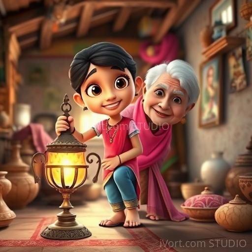In a quaint Indian village nestled between lush green fields and colorful markets, young Anaya discovered an old, mysterious lamp in her grandmother’s attic. It shimmered softly, but strangely, it had no flame and no oil. Curious and excited, Anaya wondered what magic this lamp held and decided to find out more about it.