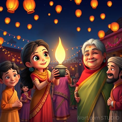 The next day, Anaya shared her discovery with her family. That evening, the entire village gathered for Diwali, the Festival of Lights. As lanterns floated in the night sky and diyas flickered on every doorstep, the mysterious lamp in Anaya’s hands glowed brighter than ever, filling everyone with joy and wonder.