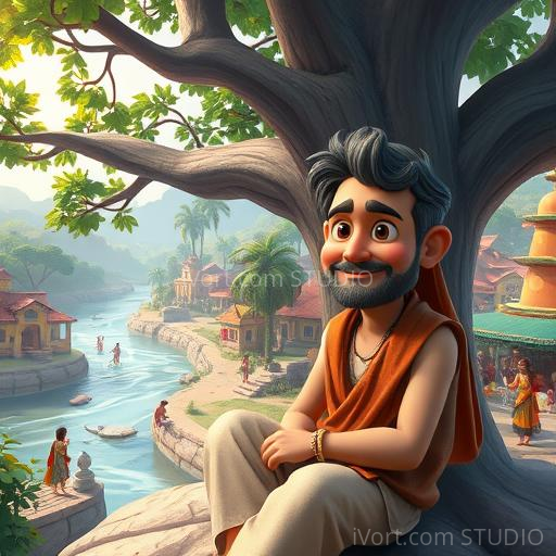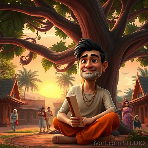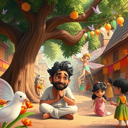 In a small vibrant village nestled among lush green fields and colorful flowers, lived a kind-hearted blind poet named Raghav. Despite his blindness, he was famous for his beautiful poetry that touched everyone's heart. One day, Raghav sat under a giant banyan tree, feeling a little sad because he wished he could see the world he described in his poems. Suddenly, a shimmering fairy appeared, smiling kindly, offering him three magical wishes. Raghav’s eyes sparkled with hope and curiosity as he wondered what he should wish for first.