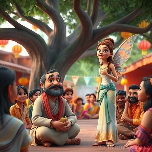 Thinking about his village, Raghav said, 'For my last wish, I want happiness for everyone—children, elders, animals, and plants.' The fairy nodded happily and waved her hand. Suddenly, the village shimmered with joy—children danced, elders smiled, birds chirped happily, and flowers bloomed brighter than ever. Raghav’s heart swelled with love. He realized that true happiness comes from sharing kindness and caring for others. From that day, Raghav’s poetry spread happiness far and wide, reminding everyone of the magic of kindness.